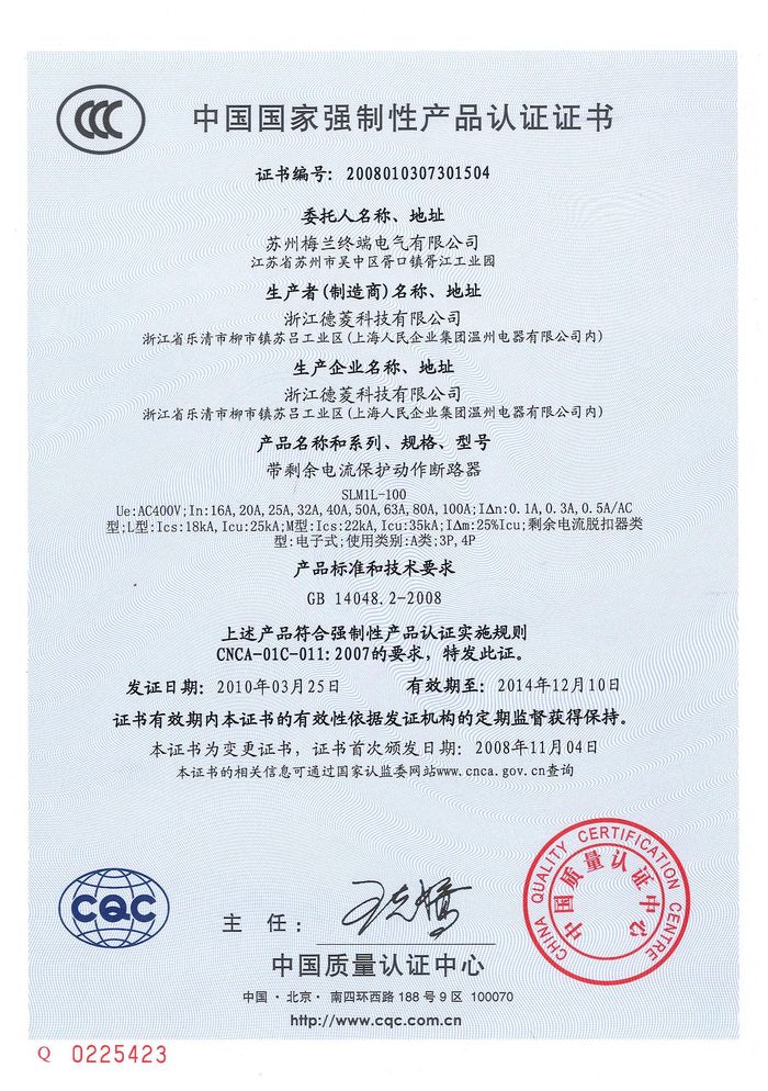 SLM1L-100塑殼斷路器資質(zhì)證書