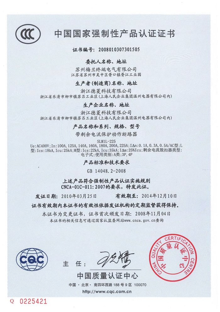SLM1L-225塑殼斷路器資質(zhì)證書