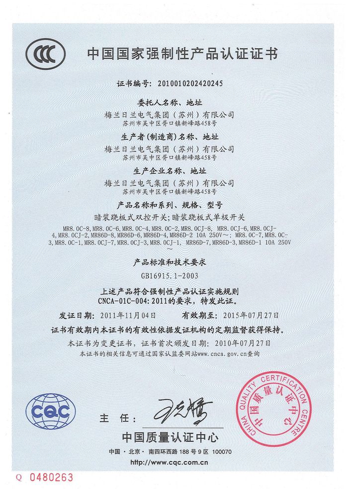 MR8.0C開(kāi)關(guān) 86D插座資質(zhì)證書(shū)