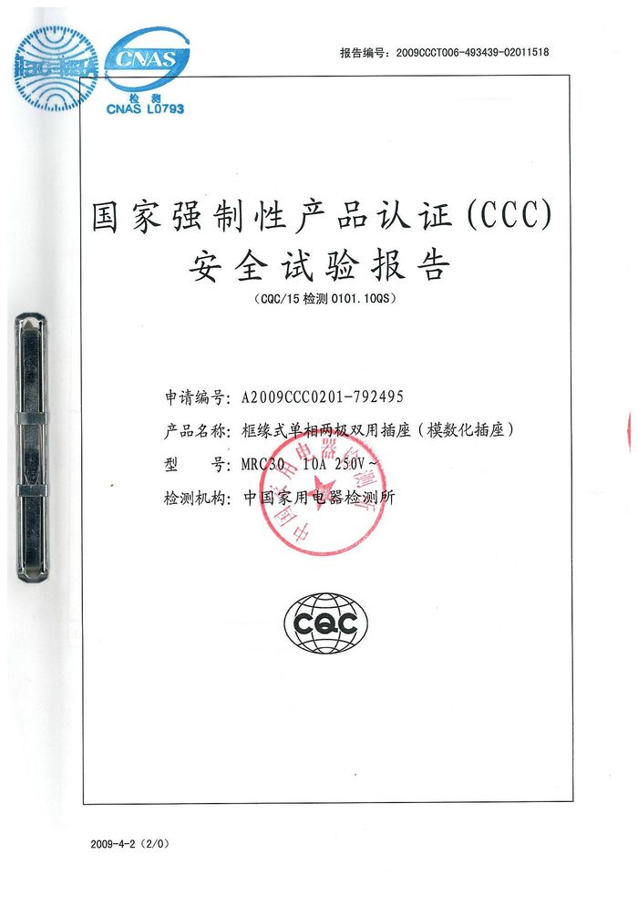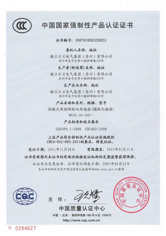 MRC30模數(shù)化插座資質(zhì)證書(shū)