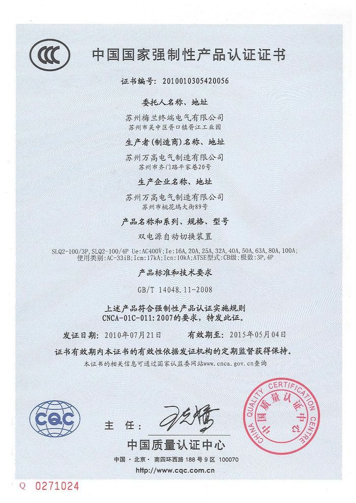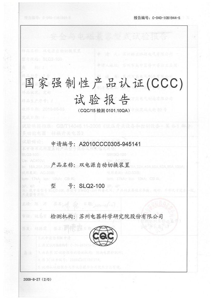 SLQ2-100雙電源資質(zhì)證書