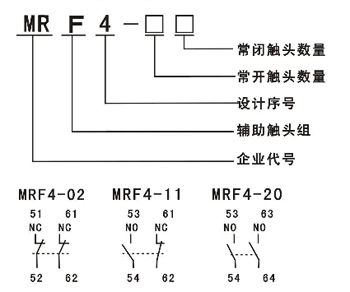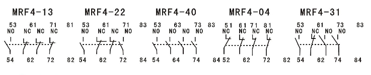 MRF系列有二極和四極兩種,該輔助觸頭組和交流接觸器或接觸器式繼電器組合后能擴(kuò)展輔助觸點(diǎn)的數(shù)量。