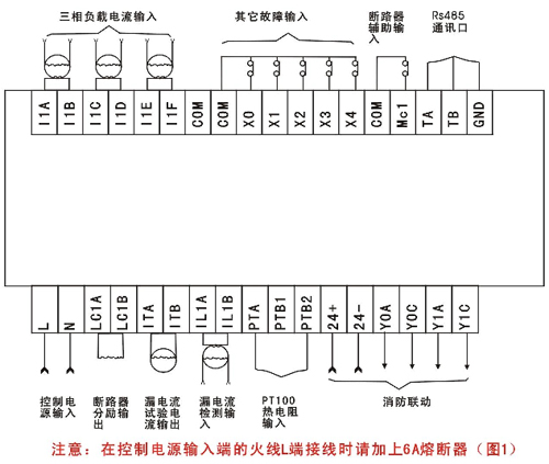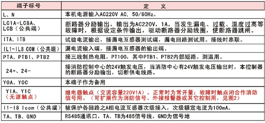 斷路器分勵(lì)輸出,輸出為AC220V或AC36V,lA。當(dāng)發(fā)生漏電、過載、溫度過高等故障時(shí),根據(jù)設(shè)定條件輸出,驅(qū)動(dòng)斷路器分勵(lì)線圈,使斷路器跳閘。