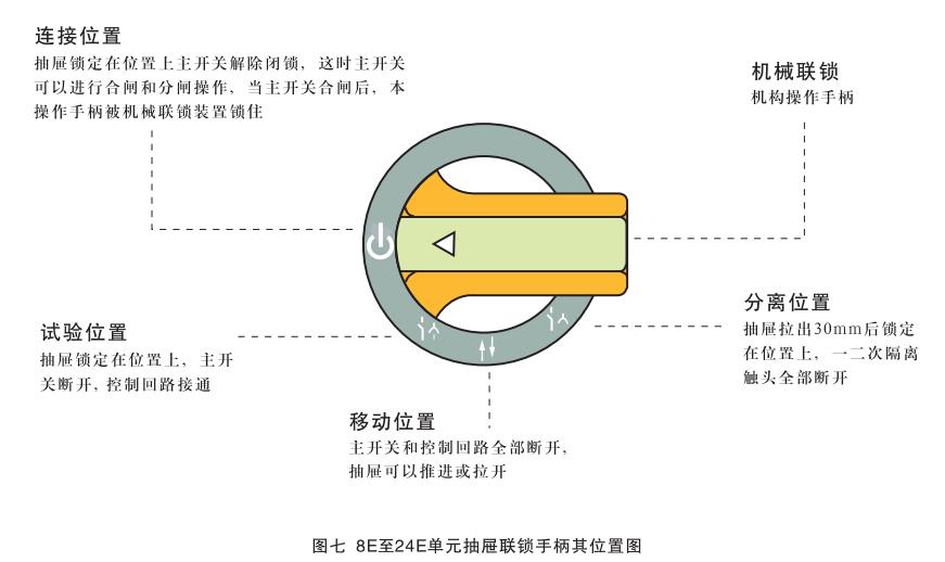 8E/4, 8E/2單元抽屜的操作:這種操作是通過(guò)對(duì)抽屜面板上的手柄進(jìn)行操作實(shí)現(xiàn)的,見(jiàn)圖六。只有當(dāng)手柄上的白箭頭指示“移動(dòng)位置”(↑↓)時(shí),抽屜方可抽出或插入,在其它任何位置上,抽屜都應(yīng)被鎖定,因此不可能對(duì)抽屜實(shí)施抽出或插入操作。此時(shí)不可硬拉或硬拖以免損壞機(jī)械聯(lián)鎖機(jī)構(gòu),抽屜從連接位置抽出30mm(此時(shí)手中工件一輕微震頗感)時(shí)將操作手柄向逆時(shí)針?lè)较蜣D(zhuǎn)過(guò)45°,抽屜即被鎖定在“分離位置”(↑↓)此時(shí)一次和二次隔離插件均己脫離電網(wǎng)并形成安全間隔。