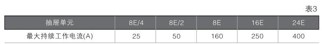 c)抽屜分為8E/4, 8E/2, 8E, 16E和24〔五種單元。各種抽屜持續(xù)工作電流的選用按表3